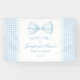 Cute classic preppy baby boy shower welcome sign banner featuring baby blue bow tie surrounded by gingham pattern.
