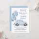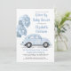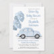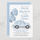 A fun and cute drive by baby boy shower invitation featuring pastel blue script and a watercolor illustration of a retro blue car with silver and blue balloons. You can easily personalise the drive-by party details.