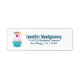 Return address labels with a cute blue cupcake with pink frosting and a kawaii smiling face. A cherry on top also has a cute happy face. A shooting star is flying in the air.