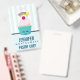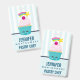 Name badg ewith a light blue and white striped pattern paired with a blue and pink polka dot pattern. Layered over top is a cute blue cupcake with pink frosting and a kawaii smiling face. A cherry on top also has a cute happy face. A shooting star is flying in the air