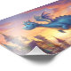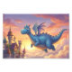A charming blue dragon soars peacefully above a fairytale castle during a warm sunset. This whimsical fantasy artwork features soft pastel colors and a storybook atmosphere that brings magic and wonder to any space.