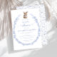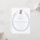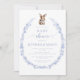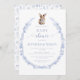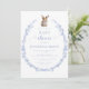 Adorable baby boy shower invitation featuring a charming blue watercolor Easter rabbit surrounded by spring flower wreath.