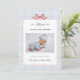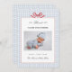 A charming blue and white gingham birth announcement card features a sweet, red bow tied at the top, adding a touch of elegance. Perfect for welcoming a baby boy. The gingham pattern adds a playful and classic touch, making this card both adorable and timeless.
