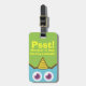 Front of luggage tag shows part of the blue monster with purple eyes and a yellow horn. The funny caption reads "Psst! Monster in bag. Bites if bag is mishandled.". A humourous way to get others to handle your bag with care. The other side however reveals that it is actually a cute little blue monster that has a yellow horn on its head, a sharp tooth protruding out of its mouth, a red tail, purple eyes and tiny arms and feet.