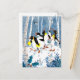 Cute blue musicians penguins snow fun Christmas in nature with white snow.