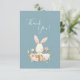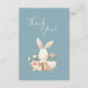 Cute “Thank you” card with watercolor Bunny in a faux wicker basket. Background blue. Perfect for your baby shower guests.