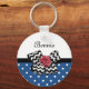 Enhance your girly style with this cute blue and white polka dot pattern keychain with a trendy black and white chevron bow and a chic red ribbon rose. This blue and red retro meets modern design can be personalised by adding the name of your teen girl. Flat printed image, NOT actual rosette ribbon and bow.