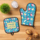 This cute oven mitt and pot holder features an adorable pattern with colourful white birds, red hearts, and sweet yellow mugs against a bright blue background. Personalise with your name. Makes the perfect gift for your wife, mum, or grandma for Mother's Day, birthday, or special occasion.