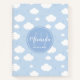 This design features cute little white cloud pattern on pastel blue sky background with monogram and name in modern script font style.