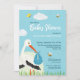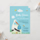 Cute customisable boy baby shower invitation template featuring a hand drawn stork with bees and butterfly on a meadow and sky blue background. Blue stork makes special delivery of a baby boy. Celebrate the impending arrival of the new baby boy with this cute stork baby sprinkle boy invitation card. Personalise the invitation with your text and info.