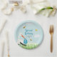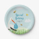Cute customisable boy baby shower paper plate features a hand drawn stork carrying special delivery, with bees and butterfly on a meadow. Blue stork makes special delivery of a baby boy. Celebrate the arrival of the new baby boy with this cute stork baby sprinkle boy paper plate. Personalise the baby shower plate with your text and info.