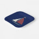 A cute blue toy sailboat with a red and blue striped sail floats on a royal blue background.
