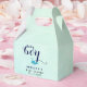 This adorable favour box for a baby shower has a cute ocean theme with a blue whale design. The box is decorated with the words "Baby boy" in a deep navy blue colour, and there is a little blue whale happily spraying hearts on a light blue background. What makes it even more special is that it includes the name of the mother-to-be, adding a personal touch to the celebration.