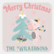 This custom Christmas holiday sticker features a cute, girly boho style cartoon illustration. A pretty pink unicorn is decorating her Christmas tree beneath falling snowflakes. The background is a soft blush pink colour.