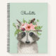 An adorable watercolor woodland racoon illustration in boho style with a crown of pink and burgundy flowers, ferns and greenery accented with feathers. Personalise this unique notebook with your name by editing the sample name shown in the design template. The pastel mint green background in this design can be changed to any other colour by choosing "customise further" and selecting a different background colour.
