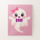 Imagine a charming little ghost, complete with a sweet pink bow and sparkling purple eyes, gently saying "Boo!" in a playful, friendly manner. It’s hard not to smile at such an endearing spirit!