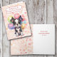 Here's a cute Valentine card for kids and adults alike. The front shows an adorable black and white Boston Terrier puppy with pink, blue, and green balloons. Behind the image is a pattern of pastel pink hearts, and a white banner at the top currently says "Balloons & Puppy Dog Kisses". All the text, front and inside, is easily changed to anything that you'd like.
