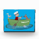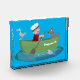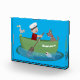 For nautical fun! This design features a boy rowing his boat on the ocean with a dog and sea gull with a happy fish saying hello! Drawn in cute cartoon illustration style.