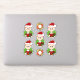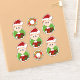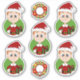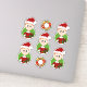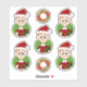 Set of seven cut-vinyl stickers with an illustration of a cute little happy smiling boy with short ginger hair, who is dressed in Christmas clothes and is wearing a red Santa Claus hat, on a green background; five stickers of the boy and two stickers with a Christmas wreath