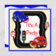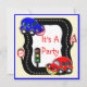 A cute picture for all those little boys who love playing with cars; in bright colours it's a fun way to announce a birthday party and easy to personalise with your details.