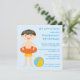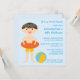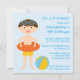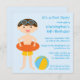 This 5.25x5.25 boys birthday party invitation has a cute pool theme. There is a boy standing with a swimming tube around his waist next to a beach ball. You can easily customise your party information on the right. Artwork created by Babystar Design