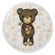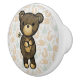 A ceramic door knob designed with a simple illustration of a cartoon brown bear holding a yellow daisy. A fox and forest pattern layered behind.