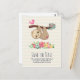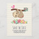 Save the date postcard with an illustration with a cute brown sloth hanging upside down. This funny little guy is holding onto a branch which has a little pink bird on