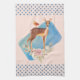A kitchen towel with a pretty brown deer with a white spotted back. A little bird sitting on the deer's back. A fancy floral bouquet with watercolor roses and light olive green leaves under the deer's feet. A blue watercolor rectangle behind the image. A polka dot border along the top and bottom. Innocent and sweet design with rustic elegance. Peach coloured background.