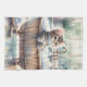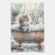 A charming watercolor illustration of an adorable kitten enjoying a bubble bath in a rustic wooden tub, with a serene backdrop of plants and soft natural light filtering through a window.