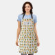 An apron with a cute patterned background. Whimsical bees and rainbows with little hearts and stars scattered around. Adorable and delightful. A rectangle layered over top with your personalised name inside.