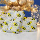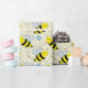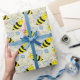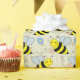 Yellow and black bumble bees as a repeat pattern with some flowers, hearts, swirls, twirls, and bee trails.