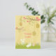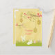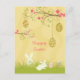 This Easter post card has a soft yellow / tan swirl background with lots of small white dots scattered all about. At the top, there is two branches with bright fuchsia pink flowers that has decorated eggs hanging from them. At the bottom, there are two bunnies hopping around some grass along with two eggs on the right. Happy Easter is written towards the middle. On the backside, there is the same soft yellow dots pattern on both sides. It is left blank with no message so you can write it in at home or customise it yourself before purchasing.