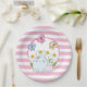Paper plates with a pink and white striped background. A white circular frame with a pink border layered over top. Inside the frame an illustration a mum and baby bunny standing together. Yellow daisies in the background. Whimsical butterflies fluttering about.