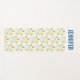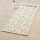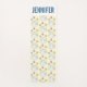 Patterned yoga mat personalised with a name. Designed with a cute mum and baby bunny standing together. Yellow daisies in the background. Whimsical butterflies fluttering about. Pale yellow background.