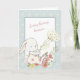 On the front of this adorable Mother's Day card is a little white bunny dressed in a pink flower suit and holding dainty white flowers. The bunny sits in the middle of a pastel pink and yellow bouquet of flowers. The image is framed with a blue and cream pattern, and the center has soft pink script that says "Every bunny knows..." The inside continues the thought "I have the best Mama in the world", but you may easily change it to something else, if you'd like. There's another image of the bunny with a balloon at the bottom.