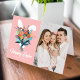 Cute Easter photo card featuring a white bunny holding a bouquet of colourful spring flowers with a pink background. "Happy Easter" is displayed in bold script lettering with your name shown below. The inside of the card features space for your typed or handwritten message. The back of the card features a matching floral pattern.