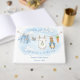 The Guestbook features sweet watercolor clotheslines on front and back strung across the center, proudly displaying tiny, adorable items, each featuring a cute bunny dressed in blue. The scene is all rendered in a soft watercolor style. Easily add your own details and change the font style, size color and placement if you would like to.