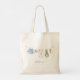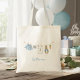 The tote bag features sweet watercolor clotheslines on front and back strung across the center, proudly displaying tiny, adorable items, each featuring a cute bunny dressed in blue. The scene is all rendered in a soft watercolor style. Easily add your own details and change the font style, size color and placement if you would like to.