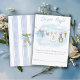 This cute baby bunny clothesline theme features a sweet watercolor clothesline strung across the center, proudly displaying tiny, adorable items, each featuring a cute bunny dressed in blue. The back shows a custom hand-painted crisp blue vertical stripe pattern accented with a lush carrot and darling blue bow creating a clean, classic, and welcoming look all rendered in a soft watercolor style.