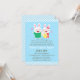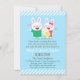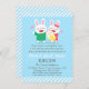 Hold a couple baby shower and invite guests with this cute, colourful and cheerful baby shower invitation! It features a bunny family with papa bunny in a green tee, mummy bunny with a red bow and dress and a baby bunny wrapped up in yellow with a pacifier in its mouth. Blue and white slanted stripes pattern for the border. Personalise easily with your party details. Design is gender neutral and is going to keep the guests guessing on the gender of the baby.
