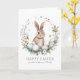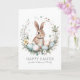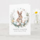 Send heartfelt Easter wishes with this beautifully designed folded greeting card, featuring a charming brown bunny nestled in an Easter-themed wreath of pastel-coloured eggs, delicate florals, and lush greenery. Soft watercolor splashes add an artistic touch, enhancing the whimsical, springtime feel.