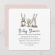 Cute bunny rabbit family illustration with modern hand script baby shower invitation, featuring a pretty pastel pink colour back of the card.