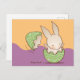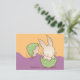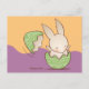 Adorable grey bunny hopping out of a green decorated egg. Light orange and purple background. Fun for Easter, Ostara, and spring festivals. Text is customisable.