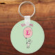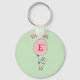 A keychain with a whimsical bunny holding a big pink balloon floating up in the air. Set on a light green background. Personalise with a name and monogram initial.