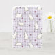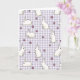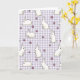 Designed with a repeating pattern of plump white bunnies 🐰, this card features simple outlines that make each little face feel approachable and sweet. The background is a light lavender-and-white gingham check that sets a calm, spring-ready scene. The bunnies appear in a mix of poses—lounging close together, sitting upright as if listening, and standing on hind legs with a curious tilt that suggests friendly attention. Soft details add warmth: faint yellow shading under their bodies and gentle pink on their noses and inner ears, like a shy blush shared between companions. Small four-petaled flowers 🌷 are scattered in between, colored purple with bright yellow centers to break up the pattern. Any greeting text can sit neatly along the top or bottom in a medium purple that matches the flowers, staying easy to read against the pale checks. The overall layout feels cozy and affectionate through the way the bunnies cluster and face one another across the grid. Tiny purple blooms with yellow centers dot the spaces between the white bunny shapes on the lavender gingham background.