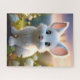 Jigsaw puzzle. A cute white rabbit with big blue eyes and fluffy fur sits amidst white flowers and green foliage, with a soft sunset in the background. The scene evokes a sense of warmth and serenity.
