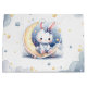 Super cute gift bag featuring cute white little bunny wearing a beautiful blue bow sitting on a lovely moon with some gold falling stars and some dusty blue clouds.