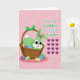 This design shows a cartoon bunny in bright lime green peeking out of a rustic, woven brown basket, giving the scene a friendly, affectionate feel 🐰. Its big dark eyes and rosy pink nose are drawn with a tender softness, as if it’s leaning forward to greet someone it cares about. Long upright ears frame its face, and a small fluffy white tail shows just above the basket rim. A leaf-shaped bow in matching green decorates the basket, tying the character and setting together. Around and inside the basket sit striped egg shapes in purple, yellow, light blue, and green, scattered like little surprises from a springtime search 🌷. The background is a muted pink with faint, layered circular patterns that add gentle texture without distracting from the main figure. On the right side, a seasonal greeting appears in teal with darker green accents, set above a neat grid of deep purple heart icons. The basket’s weave lines are detailed and slightly shadowed, and the eggs’ stripes are crisp against the soft pink backdrop.
