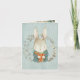 The front of this card features a cute hand drawn bunny wearing a blue coat and holding a handful of bright orange carrots. He is surrounded by a spring wreath. The background is a distressed robin's egg blue color. The inside has beautiful spring flowers framing the interior of the card with the words "Happy Easter" placed above a birds nest with three eggs inside.