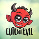 Vector cartoon illustration of a devilishly cute little devil with big eyes with Cute But Evil text. Keywords: devil, hell, cute, demon, evil, satan, halloween, monster, horns, horror, adorable, sweet, devilishly, devilish, precious, endearing, loveable, lovely, appealing, engaging, delightful, dear, darling, winning, winsome, charming, enchanting, attractive, pretty, adorbs